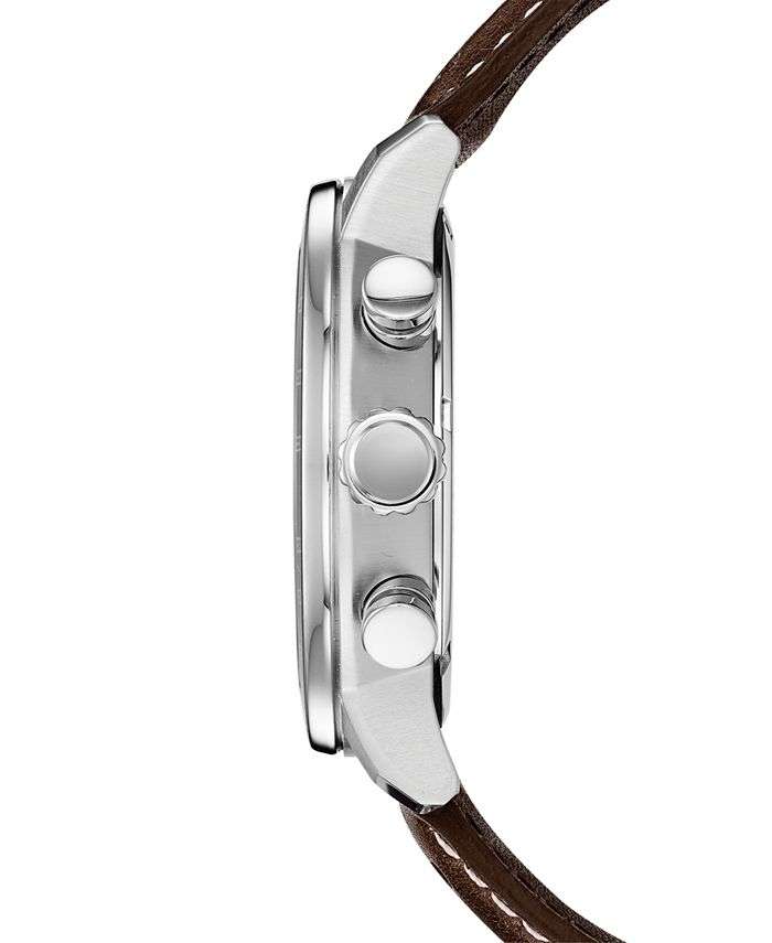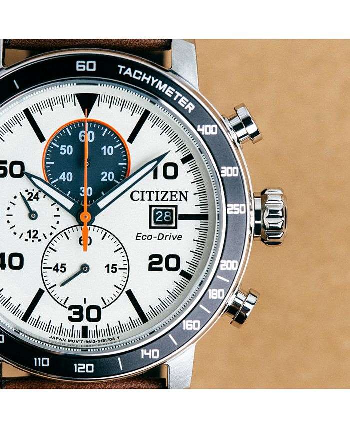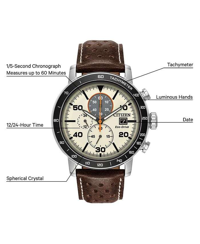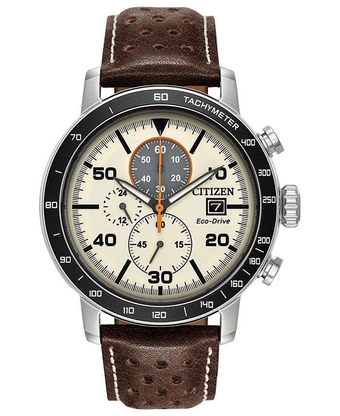 Brown perforated leather and neutral dial colors lend an earthy appeal to this technologically advanced light-powered Eco-Drive chronograph timepiece from Citizen.
