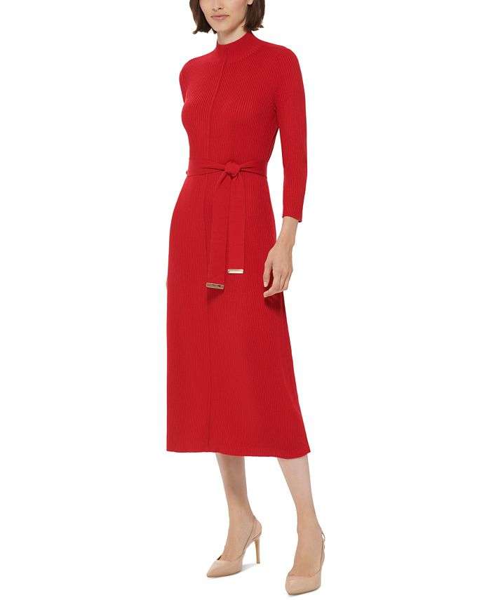 Topped off with a sleek mock neckline for added sophistication, Calvin Klein’s soft ribbed-knit sweater dress is an appealing option for the office or days out with friends.